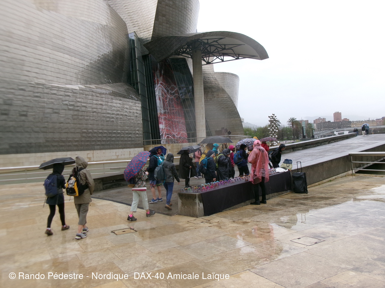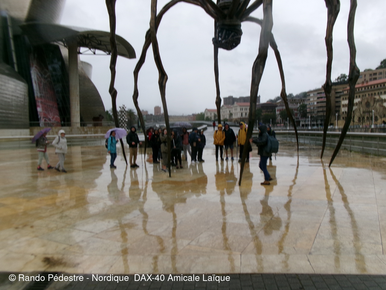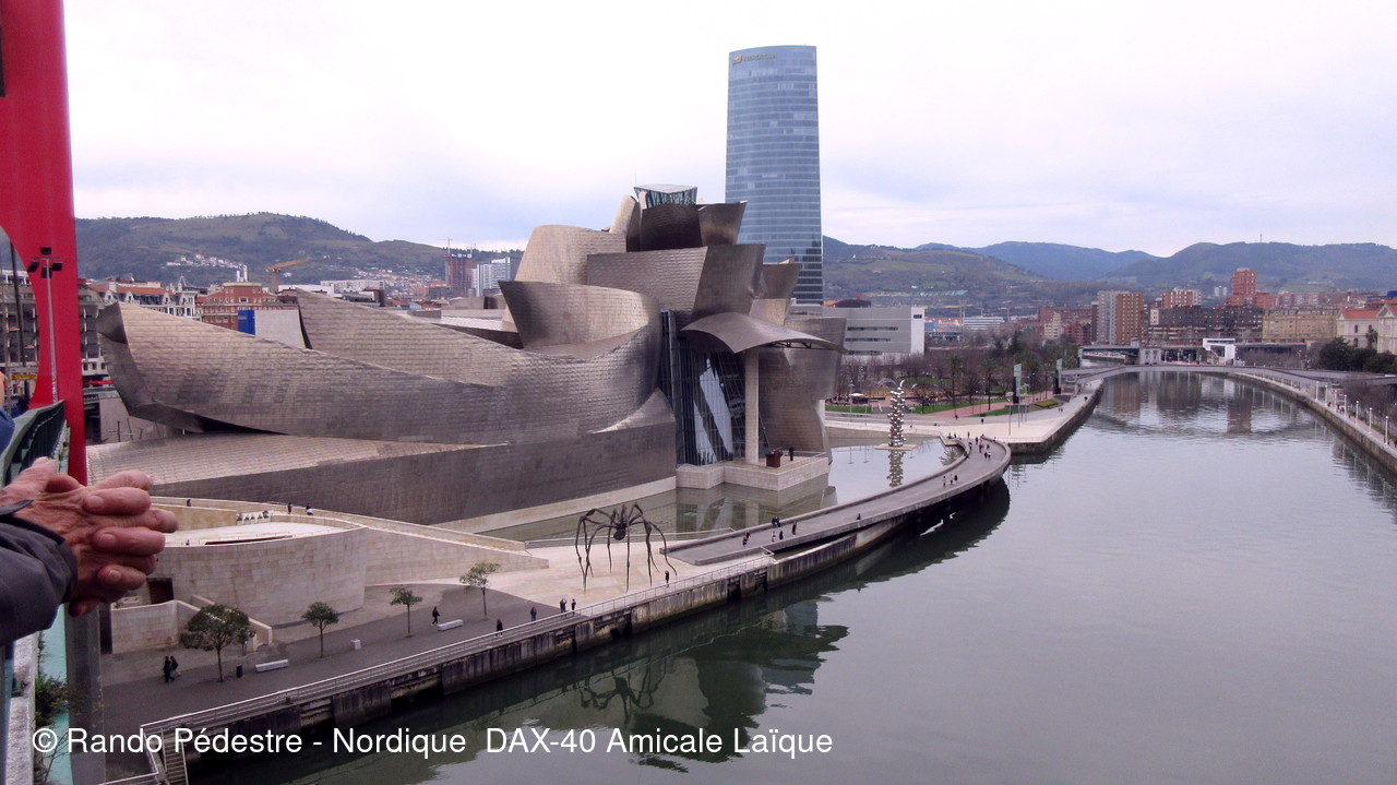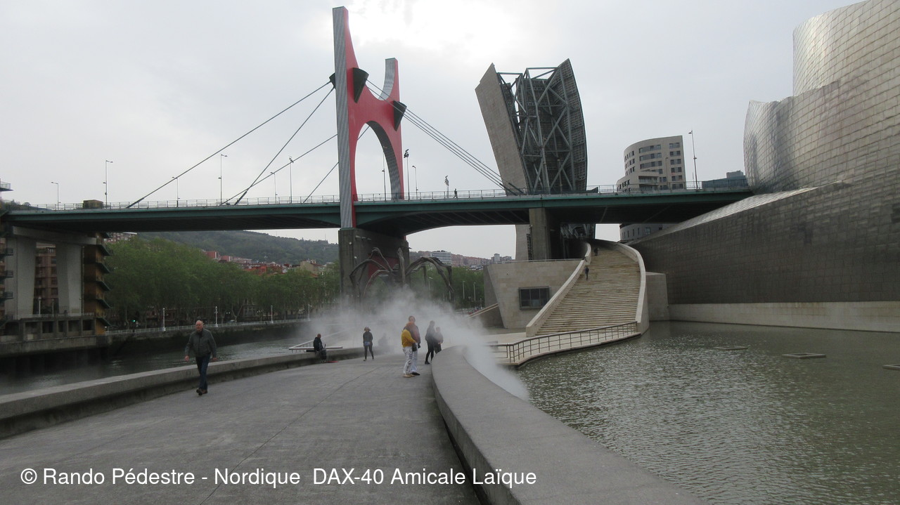 Les animateurs du groupe 1 ont pris le départ pour la descente , sous la pluie, et tous les participants se sont regroupés au pied du musée GUGGENHEIM BILBAO. Une oeuvre d'art remarquable.